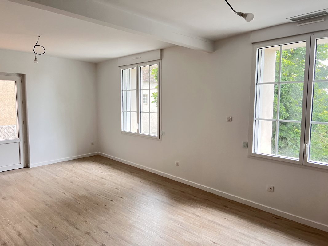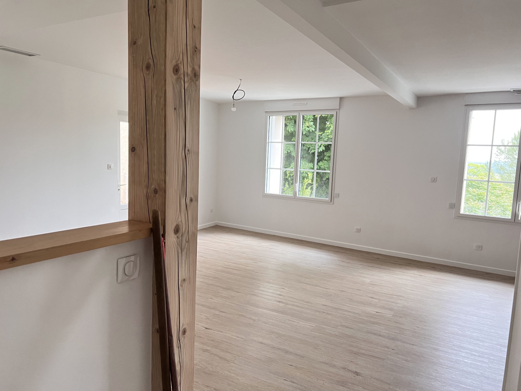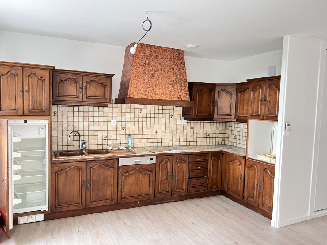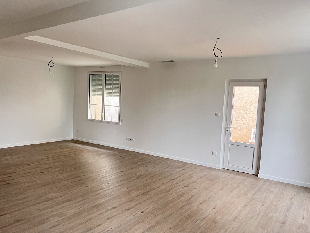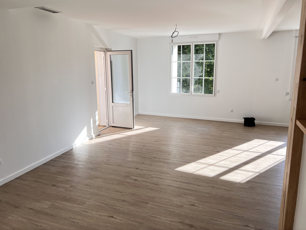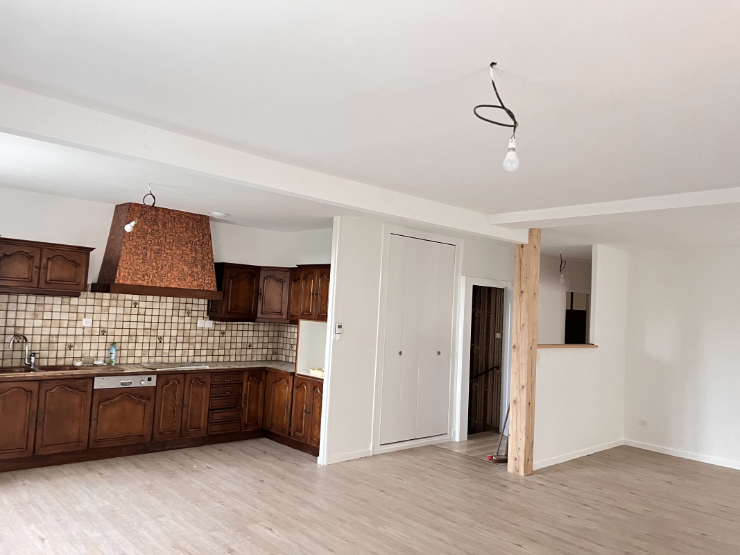 Spacieuse pièce de vie lumineuse avec cuisine ouverte et aménagée