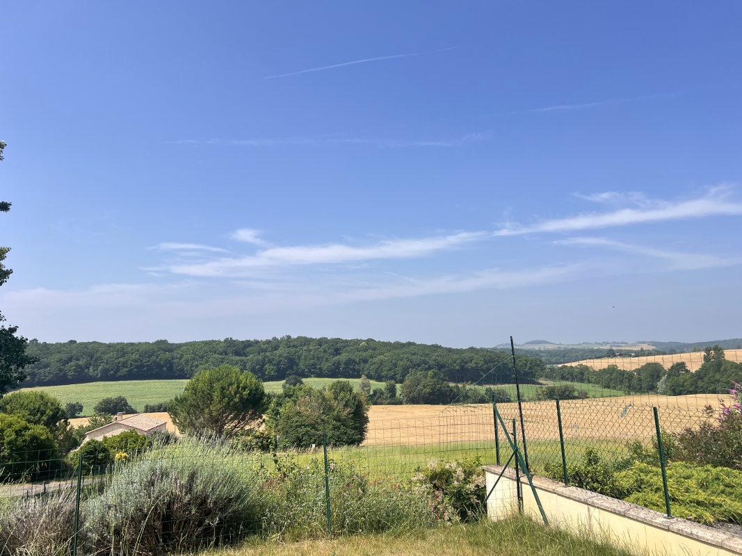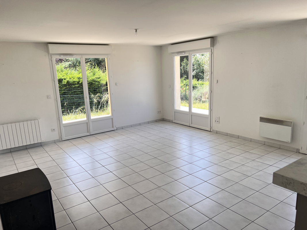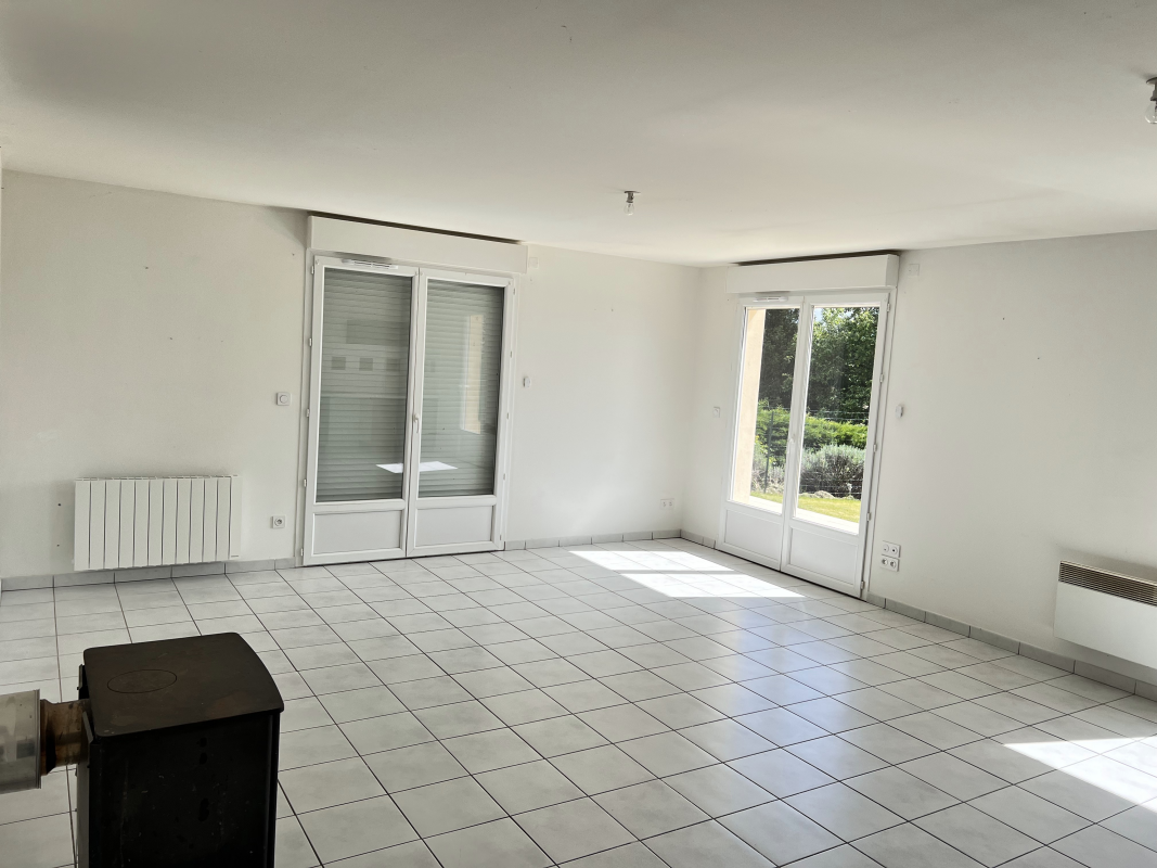 Composition : Rdc : entrée, wc séparé, dégagement avec placard, salle de douche, chambre avec placard donnant sur terrasse, grande pièce de vie avec cuisine ouverte le tout donnant sur grande terrasse avec vue campagne. A l’étage : palier avec placard, deux chambres, salle de bains avec baignoire et WC.
