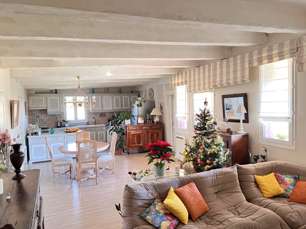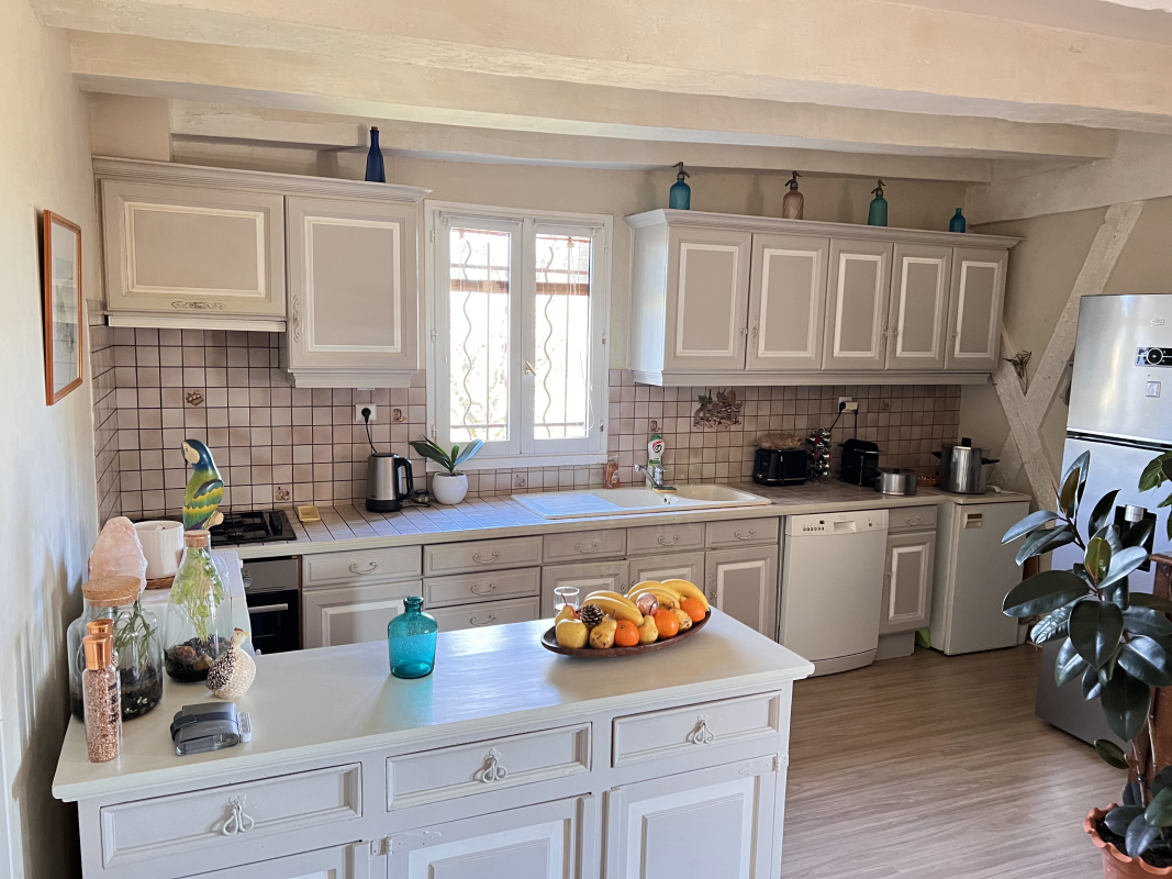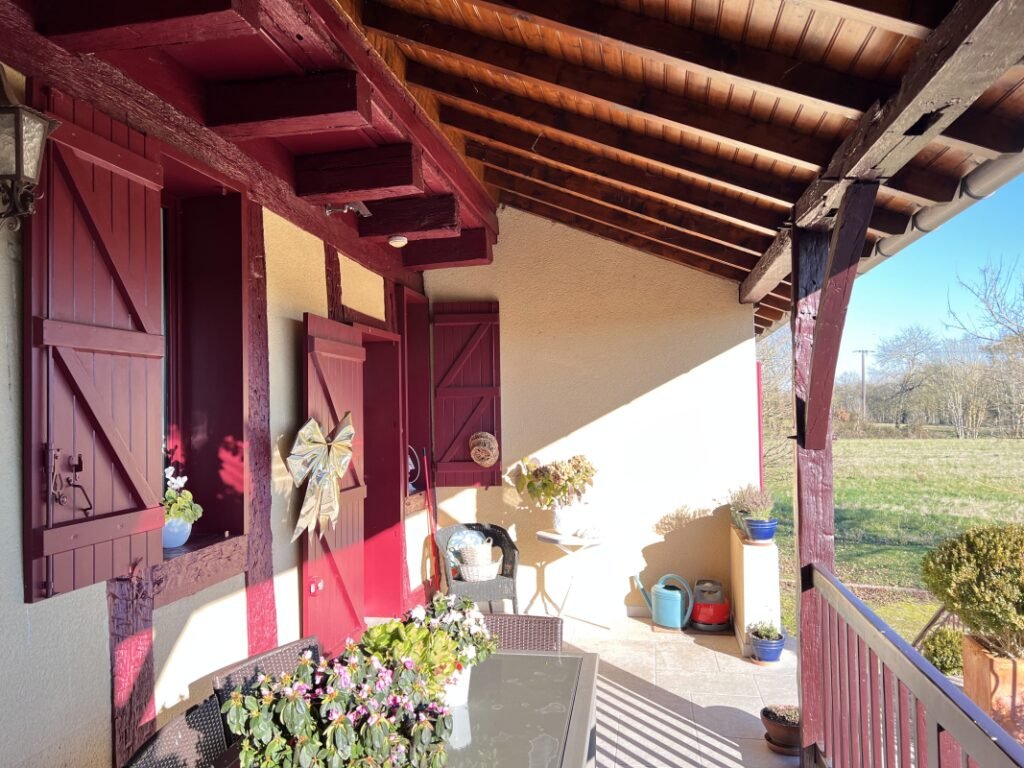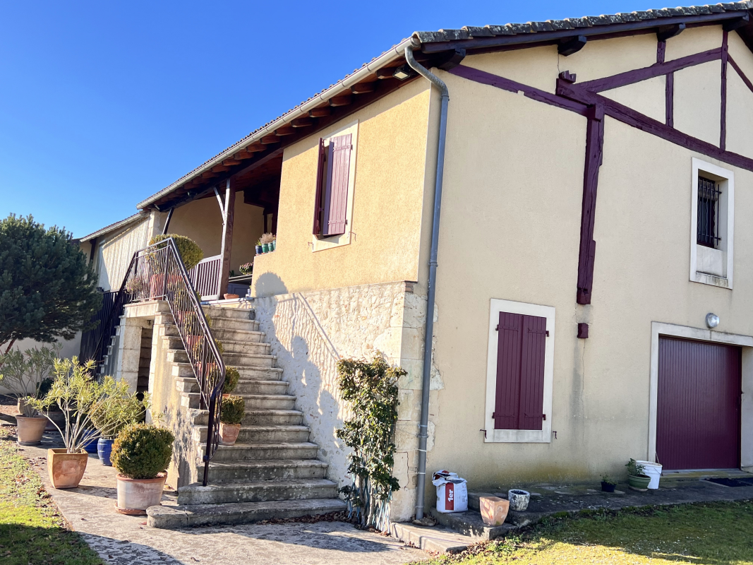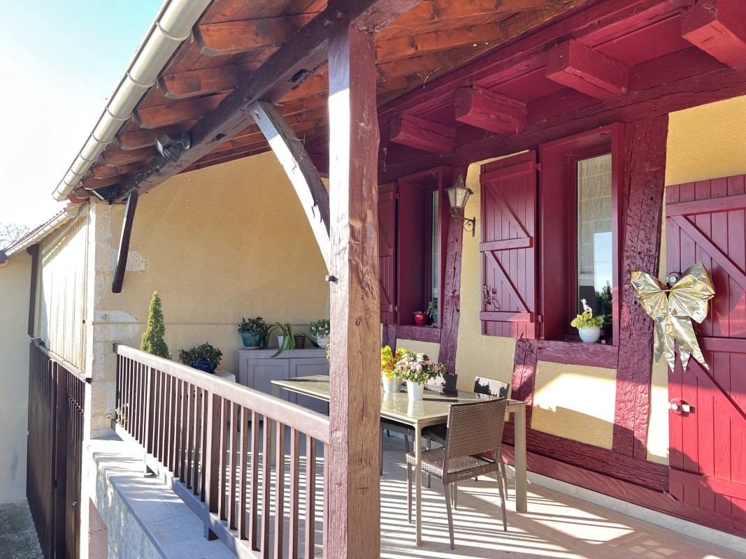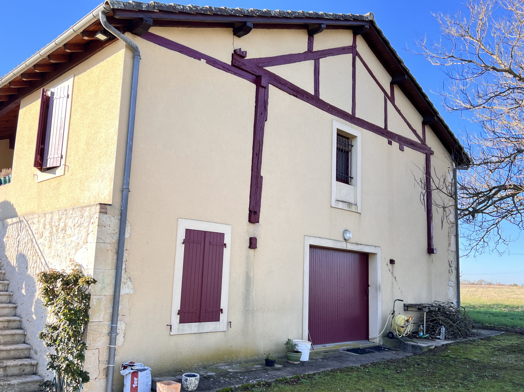 Située au calme dans la campagne proche Villereal, maison 96 m2 sur grand sous/sol avec garage, belle terrasse couverte, grande pièce de vie avec cuisine aménagée ouverte , trois chambres, salle douche/wc