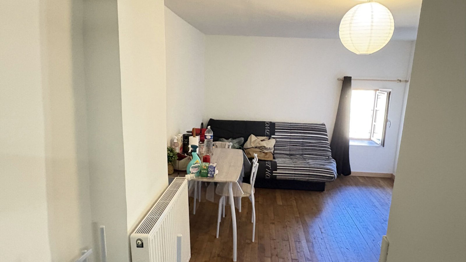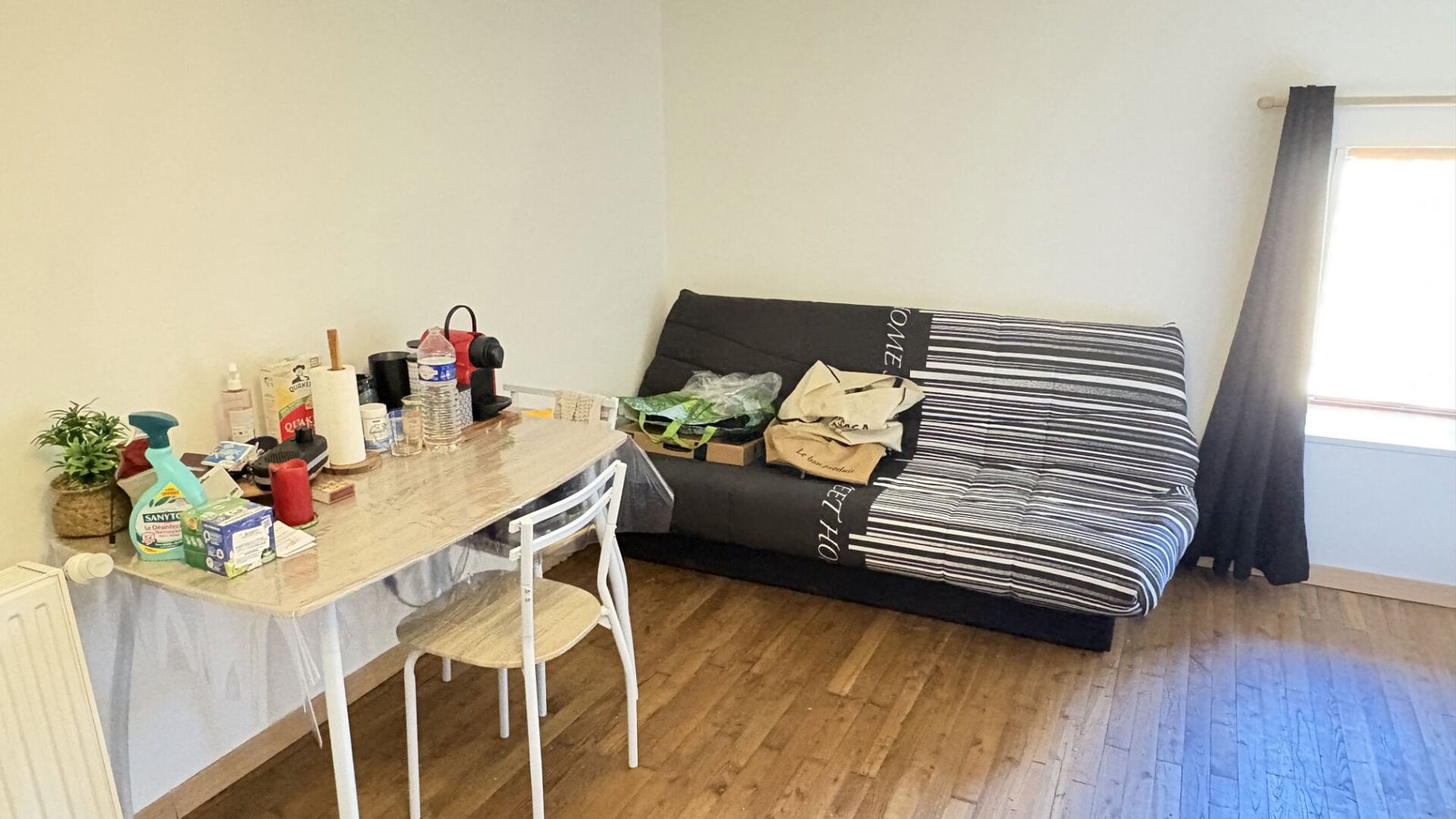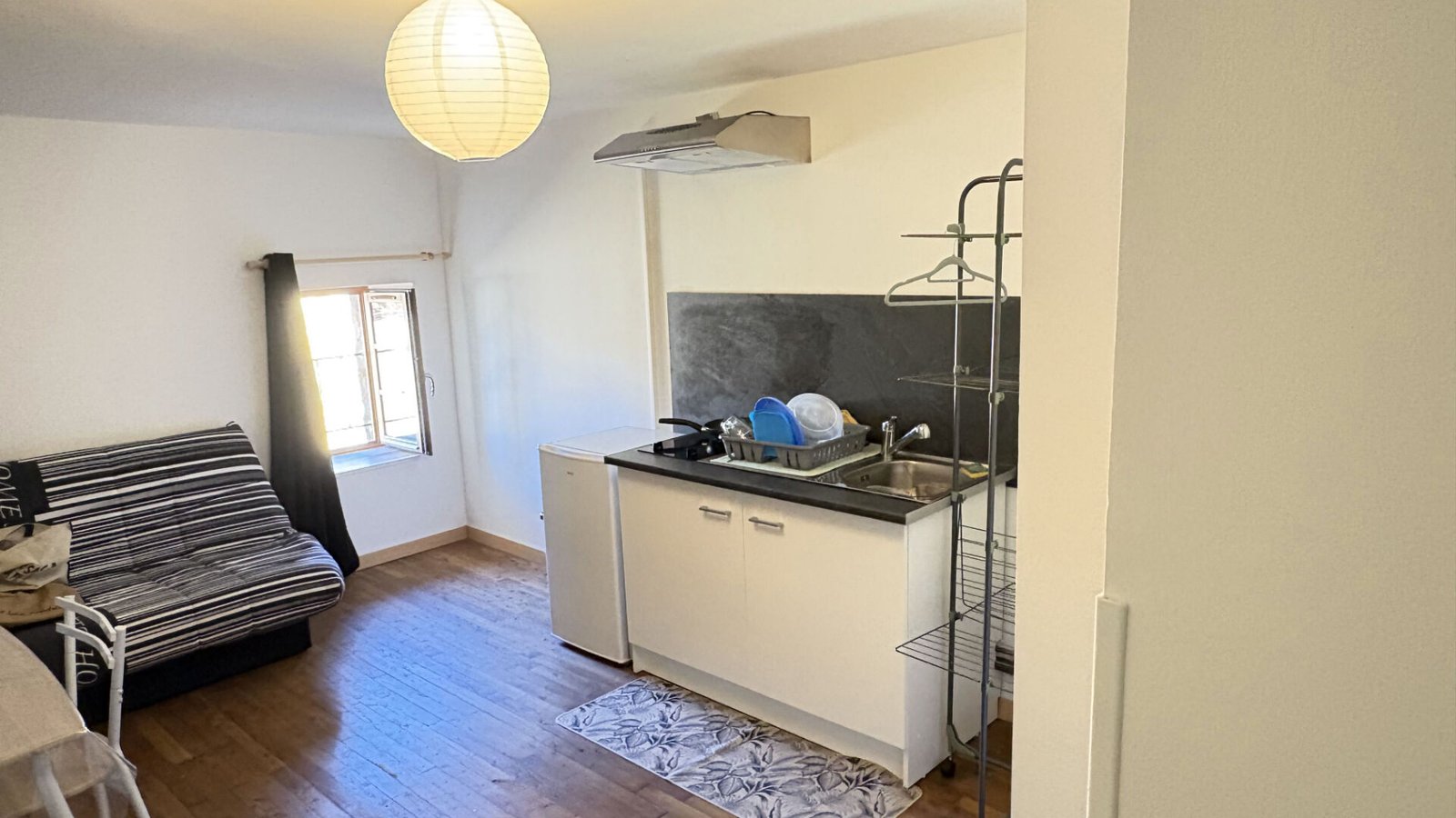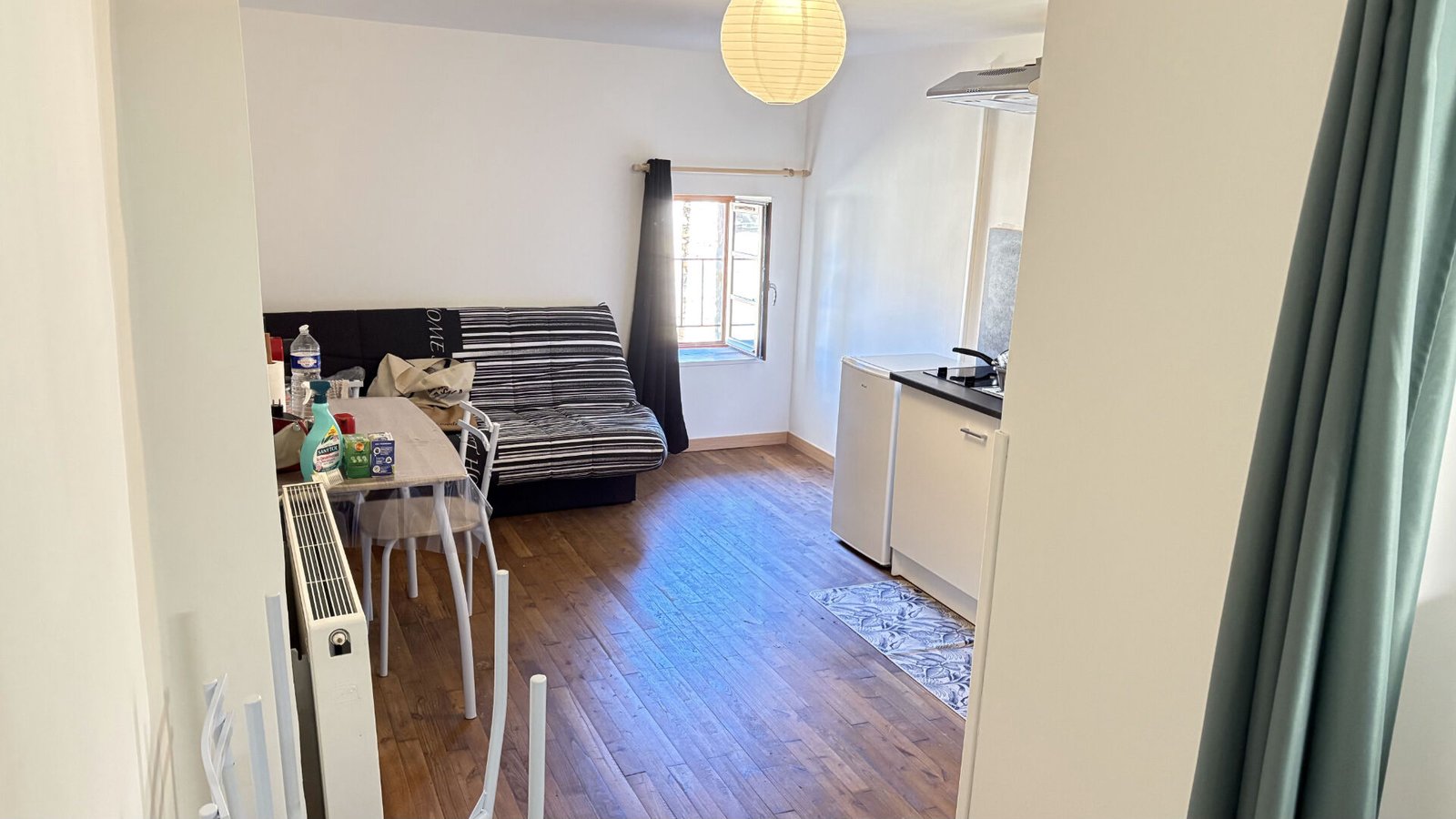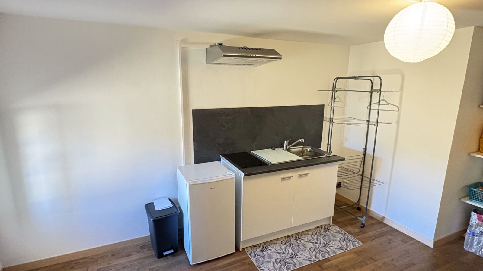 Situé à Beaumontois-en-Périgord, ce studio meublé de 17,68 m² offre une solution de logement clé en main parfaitement optimisée. La pièce de vie principale dispose d’une kitchenette équipée d’une plaque vitrocéramique deux feux, d’une hotte aspirante et d’un réfrigérateur, complétée par de nombreux rangements, une niche avec étagères et une desserte pratique. Pour votre confort, l’espace est déjà aménagé avec un canapé clic-clac, une table et quatre chaises. Le logement comprend également une salle de douche fonctionnelle intégrant les toilettes.